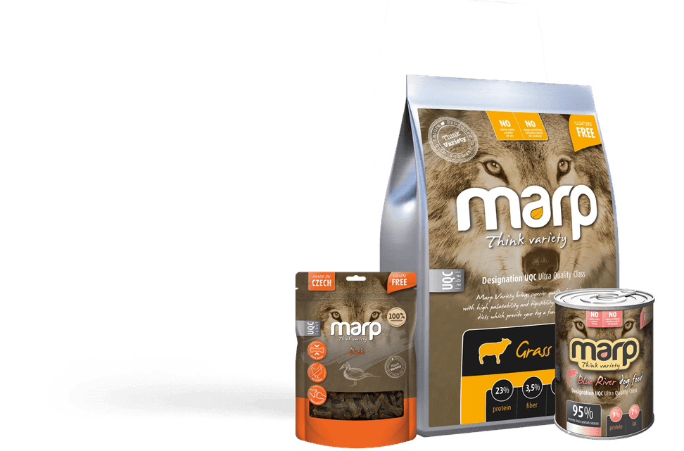 Marp think variety is our latest series in which we have returned to traditional recipes in the spirit of meat and rice, but have moved forward in accordance with options offered by today’s technology. This series is completely gluten-free, because we know that dogs can be allergic to gluten. In the same way, in this series you will not find anything made from chicken—all the recipes are free of chicken meat, fat and offal. A combination of fresh and dried meat ensures plenty of animal protein, as well as a great taste. Simple recipes without any artificial preservatives or colourings ensure that the pet food will be genuinely functional for your dog and will really benefit him.